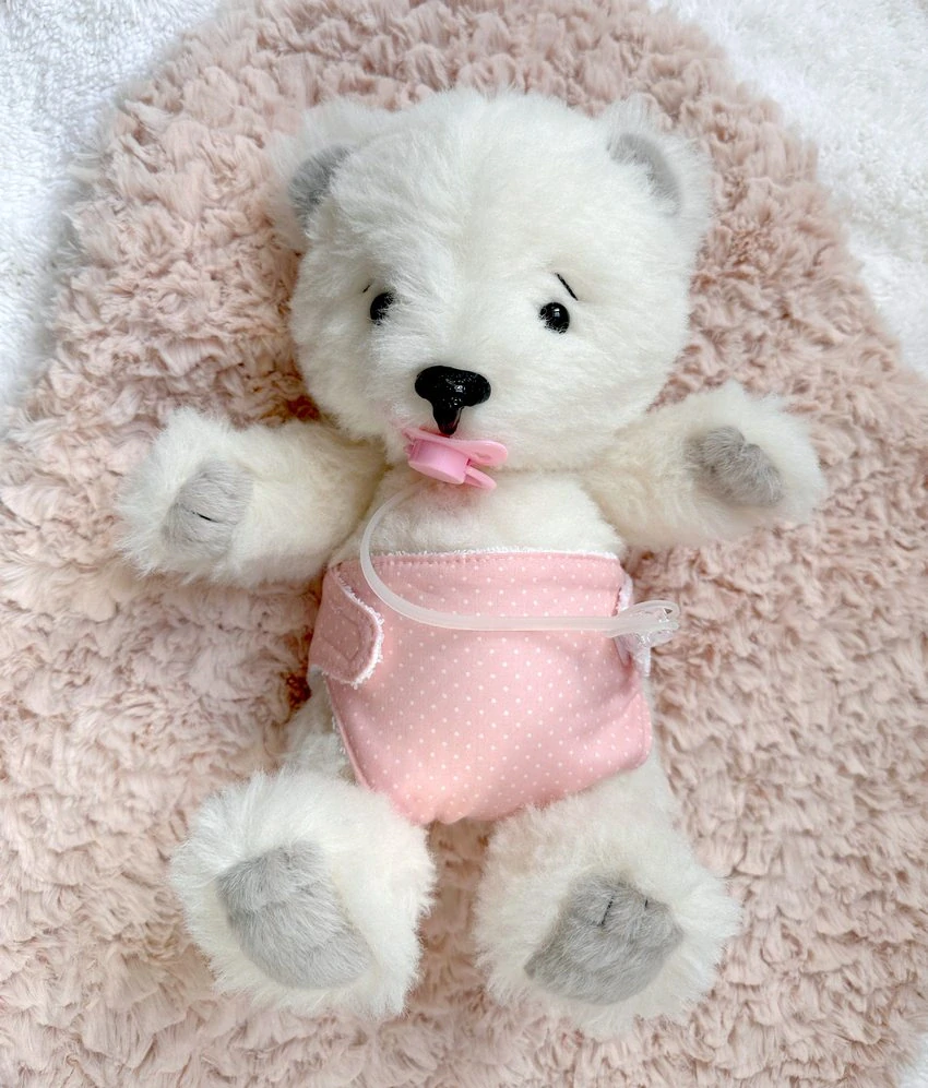 Roztomilé miminko z dušaní rodiny. Je těžší než se zdá - asi pěkně papalo - a proto krásně padne do náruče, navodí to zdání živé váhy, o to víc je miminko roztomilé a extrémně rychle přiroste k srdci. Hlavička je volnější a je potřeba ji podložit rukou jako u opravdového miminka. Ručky medvídek drží... celý popis